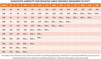 Wire size (awg or kcmil): For welding cable application suggested ampacities: A longer, thinner welding cable will carry lower ampacity.